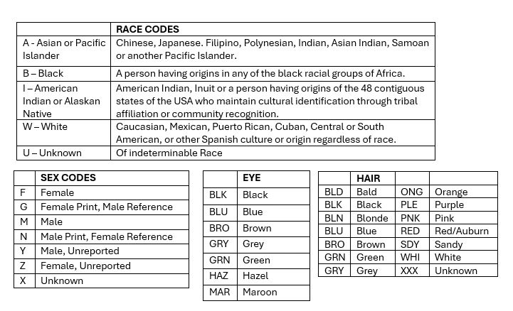 11. Enter demographics; Hair color, Eye color, Sex, Race. You can find the codes below. Enter height as 3 digits for example 5'9 would be 509.